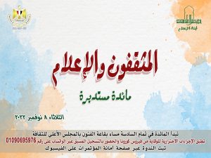 تحت رعاية د.نيفين الكيلانى وزيرة الثقافة . تقام ٦ مساء الثلاثاء المقبل (٨ نوفمبر٢٠٢٢) مائدة مستديرة بعنوان “المثقفون والإعلام” فى مقر المجلس الأعلى للثقافة.