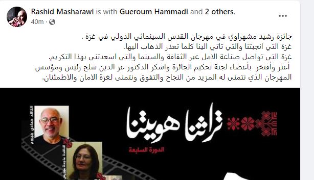كشف المخرج الفلسطيني رشيد مشهراوي عن إطلاق اسمه على جائزة لجنة تحكيم النقاد بمهرجان القدس السينمائي في دورته السابعة، حيث كتب عبر حسابه بموقع فيس بوك: “جائزة رشيد مشهراوي في مهرجان القدس السينمائي الدولي في غزة ، غزة التي أنجبتنا والتي تأتي الينا كلما تعذر الذهاب إليها.. غزة التي تواصل صناعة الأمل عبر الثقافة والسينما والتي أسعدتني بهذا التكريم، وأعتز وأفتخر بأعضاء لجنة تحكيم الجائزة وأشكر الدكتور عز الدين شلح رئيس ومؤسس المهرجان الذي نتمنى له المزيد من النجاح والتفوق ونتمنى لغزة الأمان والاطمئنان.