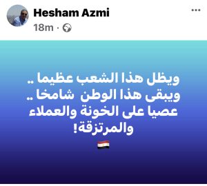 قال الدكتور هشام عزمى : (ويظل هذا الشعب عظيما .. ويبقى هذا الوطن شامخاً عصياعلى الخونة والعملاء والمرتزقة) .