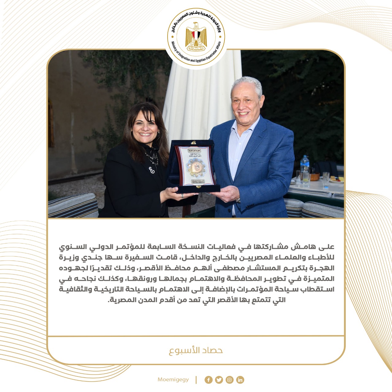 9) على هامش مشاركتها في فعاليات النسخة السابعة للمؤتمر الدولي السنوي للأطباء والعلماء المصريين بالخارج والداخل، قامت السفيرة سها جندي وزيرة الهجرة بتكريم المستشار مصطفى ألهم محافظ الأقصر، وذلك تقديرًا لجهوده المتميزة في تطوير المحافظة والاهتمام بجمالها ورونقها، وكذلك نجاحه في استقطاب سياحة المؤتمرات بالإضافة إلى الاهتمام بالسياحة التاريخية والثقافية التي تتمتع بها الأقصر التي تعد من أقدم المدن المصرية.