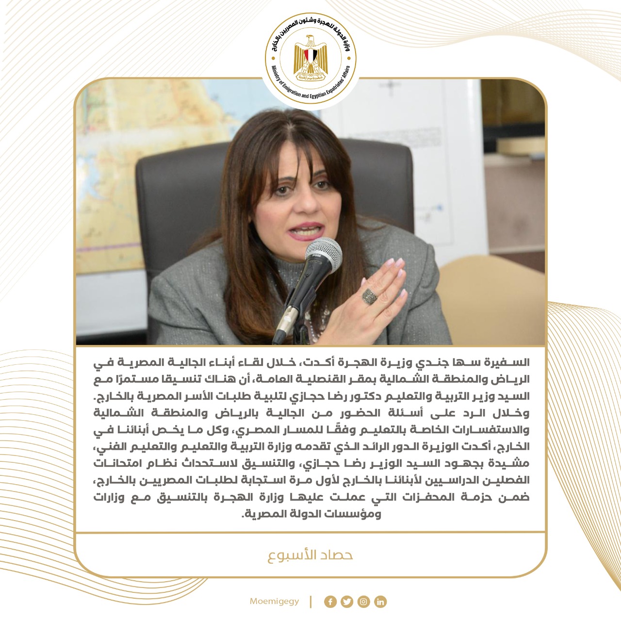 3) السفيرة سها جندي وزيرة الهجرة أكدت، خلال لقاء أبناء الجالية المصرية في الرياض والمنطقة الشمالية بمقر القنصلية العامة، أن هناك تنسيقا مستمرًا مع السيد وزير التربية والتعليم الدكتور رضا حجازي لتلبية طلبات الأسر المصرية بالخارج. وخلال الرد على أسئلة الحضور من الجالية بالرياض والمنطقة الشمالية والاستفسارات الخاصة بالتعليم وفقًا للمسار المصري، وكل ما يخص أبنائنا في الخارج، أكدت الوزيرة الدور الرائد الذي تقدمه وزارة التربية والتعليم والتعليم الفني، مشيدة بجهود الوزير رضا حجازي، والتنسيق لاستحداث نظام امتحانات الفصلين الدراسيين لأبنائنا بالخارج لأول مرة استجابة لطلبات المصريين بالخارج، ضمن حزمة المحفزات التي عملت عليها وزارة الهجرة بالتنسيق مع وزارات ومؤسسات الدولة المصرية.