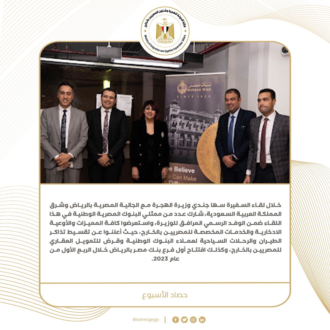 5) خلال لقاء السفيرة سها جندي وزيرة الهجرة مع الجالية المصرية بالرياض وشرق المملكة العربية السعودية، شارك عدد من ممثلي البنوك المصرية الوطنية في هذا اللقاء ضمن الوفد الرسمي المرافق للوزيرة، واستعرضوا كافة المميزات والأوعية الادخارية والخدمات المخصصة للمصريين بالخارج، حيث أعلنوا عن تقسيط تذاكر الطيران والرحلات السياحية لعملاء البنوك الوطنية وقرض للتمويل العقاري للمصريين بالخارج، وكذلك افتتاح أول فرع بنك مصر بالرياض خلال الربع الأول من عام 2023.