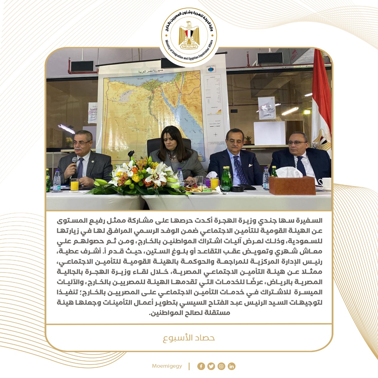 2) السفيرة سها جندي وزيرة الهجرة أكدت حرصها على مشاركة ممثل رفيع المستوى عن الهيئة القومية للتأمين الاجتماعي ضمن الوفد الرسمي المرافق لها في زيارتها للسعودية، وذلك لعرض آليات اشتراك المواطنين بالخارج، ومن ثم حصولهم على معاش شهري وتعويض عقب التقاعد أو بلوغ الستين، حيث قدم أ. أشرف عطية، رئيس الإدارة المركزية للمراجعة والحوكمة بالهيئة القومية للتأمين الاجتماعي، ممثلًا عن هيئة التأمين الاجتماعي المصرية، خلال لقاء وزيرة الهجرة بالجالية المصرية بالرياض، عرضًا للخدمات التي تقدمها الهيئة للمصريين بالخارج، والآليات الميسرة للاشتراك في خدمات التأمين الاجتماعي على المصريين بالخارج؛ تنفيذا لتوجيهات الرئيس عبد الفتاح السيسي بتطوير أعمال التأمينات وجعلها هيئة مستقلة لصالح المواطنين.