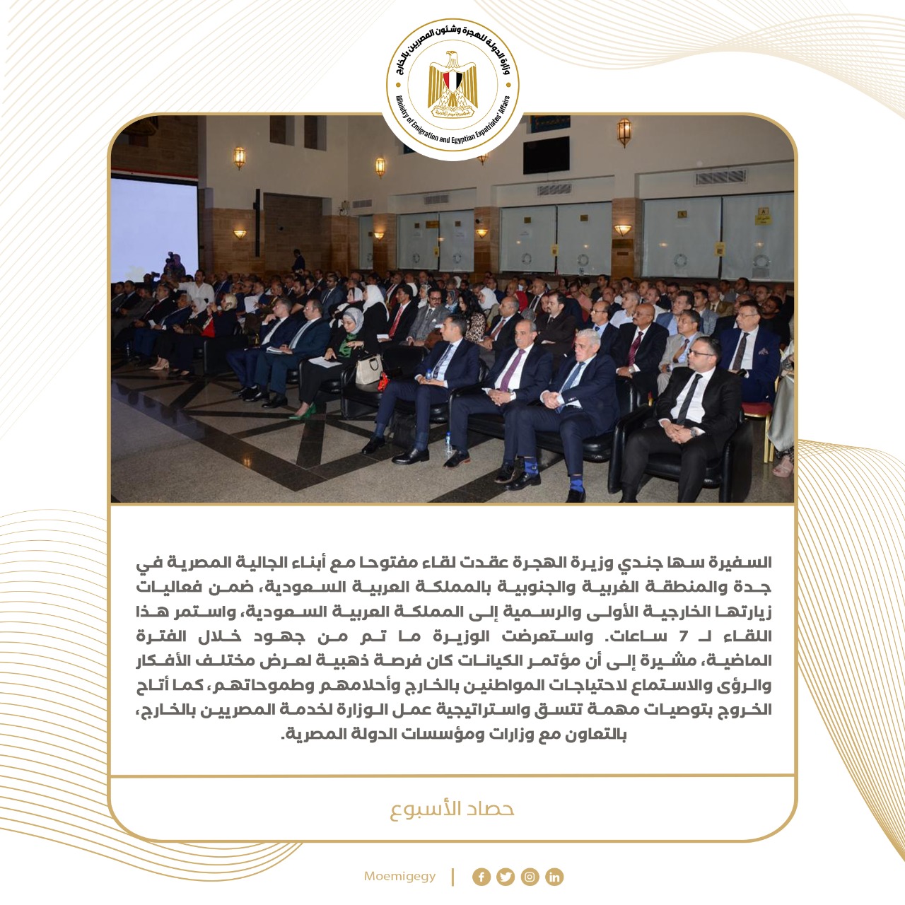 7) السفيرة سها جندي وزيرة الهجرة عقدت لقاء مفتوحا مع أبناء الجالية المصرية في جدة والمنطقة الغربية والجنوبية بالمملكة العربية السعودية، ضمن فعاليات زيارتها الخارجية الأولى والرسمية إلى المملكة العربية السعودية، واستمر هذا اللقاء لـ 7 ساعات، واستعرضت الوزيرة ما تم من جهود خلال الفترة الماضية، مشيرة إلى أن مؤتمر الكيانات كان فرصة ذهبية لعرض مختلف الأفكار والرؤى والاستماع لاحتياجات المواطنين بالخارج وأحلامهم وطموحاتهم، كما أتاح الخروج بتوصيات مهمة تتسق واستراتيجية عمل الوزارة لخدمة المصريين بالخارج، بالتعاون مع وزارات ومؤسسات الدولة المصرية.