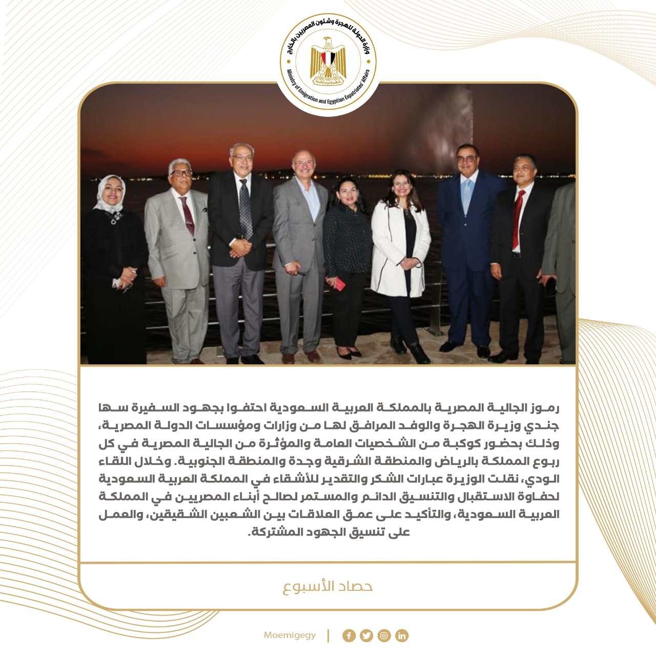 6) رموز الجالية المصرية بالمملكة العربية السعودية احتفوا بجهود السفيرة سها جندي وزيرة الهجرة والوفد المرافق لها من وزارات ومؤسسات الدولة المصرية، وذلك بحضور كوكبة من الشخصيات العامة والمؤثرة من الجالية المصرية في كل ربوع المملكة بالرياض والمنطقة الشرقية وجدة والمنطقة الجنوبية، وخلال اللقاء الودي، نقلت الوزيرة عبارات الشكر والتقدير للأشقاء في المملكة العربية السعودية لحفاوة الاستقبال والتنسيق الدائم والمستمر لصالح أبناء المصريين في المملكة العربية السعودية، والتأكيد على عمق العلاقات بين الشعبين الشقيقين، والعمل على تنسيق الجهود المشتركة.