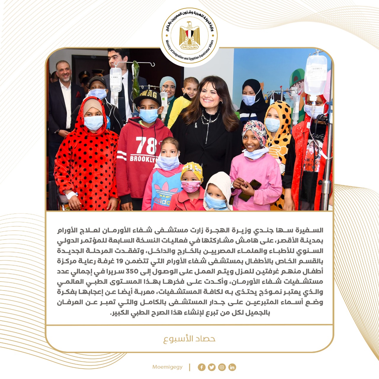 11) السفيرة سها جندي وزيرة الهجرة زارت مستشفى شفاء الأورمان لعلاج الأورام بمدينة الأقصر، على هامش مشاركتها في فعاليات النسخة السابعة للمؤتمر الدولي السنوي للأطباء والعلماء المصريين بالخارج والداخل، وتفقدت المرحلة الجديدة بالقسم الخاص بالأطفال بمستشفى شفاء الأورام التي تتضمن 19 غرفة رعاية مركزة أطفال منهم غرفتين للعزل ويتم العمل على الوصول إلى 350 سريرًا في إجمالي عدد مستشفيات شفاء الأورمان، وأكدت على فخرها بهذا المستوى الطبي العالمي والذي يعتبر نموذج يحتذى به لكافة المستشفيات، معربة أيضًا عن إعجابها بفكرة وضع أسماء المتبرعين على جدار المستشفى بالكامل والتي تعبر عن العرفان بالجميل لكل من تبرع لإنشاء هذا الصرح الطبي الكبير.