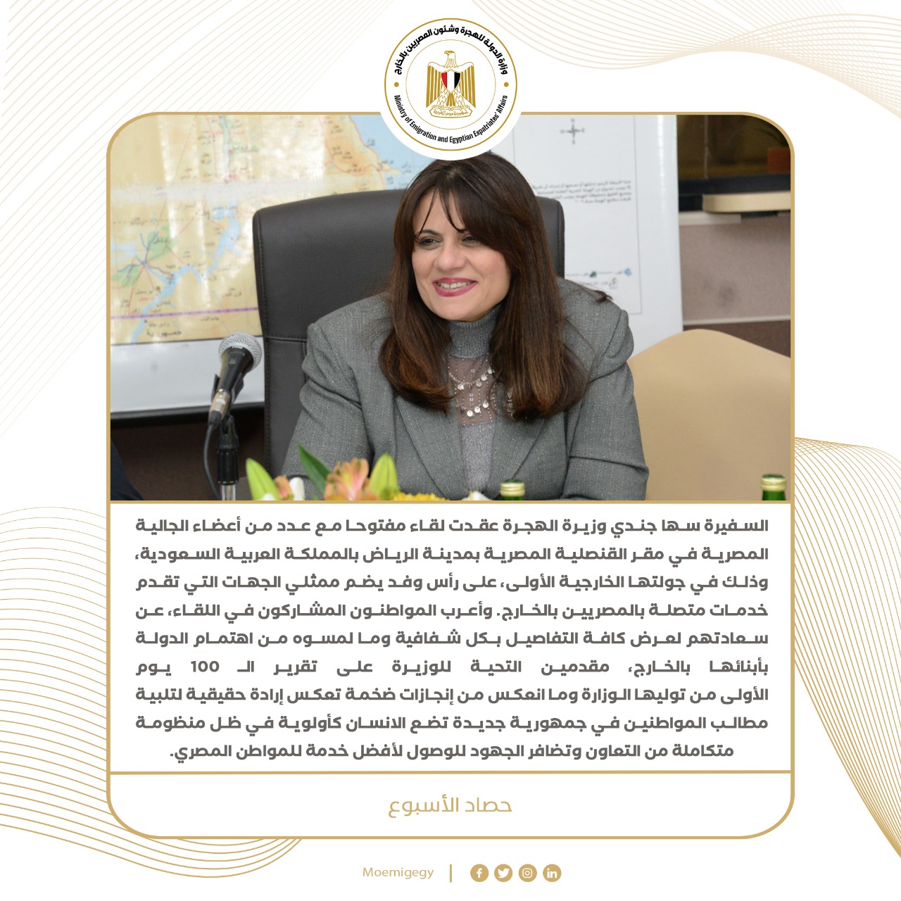 1) السفيرة سها جندي وزيرة الهجرة عقدت لقاء مفتوح مع عدد من أعضاء الجالية المصرية في مقر القنصلية المصرية بمدينة الرياض بالمملكة العربية السعودية، وذلك في جولتها الخارجية الأولى، على رأس وفد يضم ممثلي الجهات التي تقدم خدمات متصلة بالمصريين بالخارج. وأعرب المواطنون المشاركون في اللقاء، عن سعادتهم لعرض كافة التفاصيل بكل شفافية وما لمسوه من اهتمام الدولة بأبنائها بالخارج، مقدمين التحية للوزيرة على تقرير الـ 100 يوم الأولى من توليها الوزارة وما انعكس من إنجازات ضخمة تعكس إرادة حقيقية لتلبية مطالب المواطنين في جمهورية جديدة تضع الإنسان كأولوية في ظل منظومة متكاملة من التعاون وتضافر الجهود للوصول لأفضل خدمة للمواطن المصري.