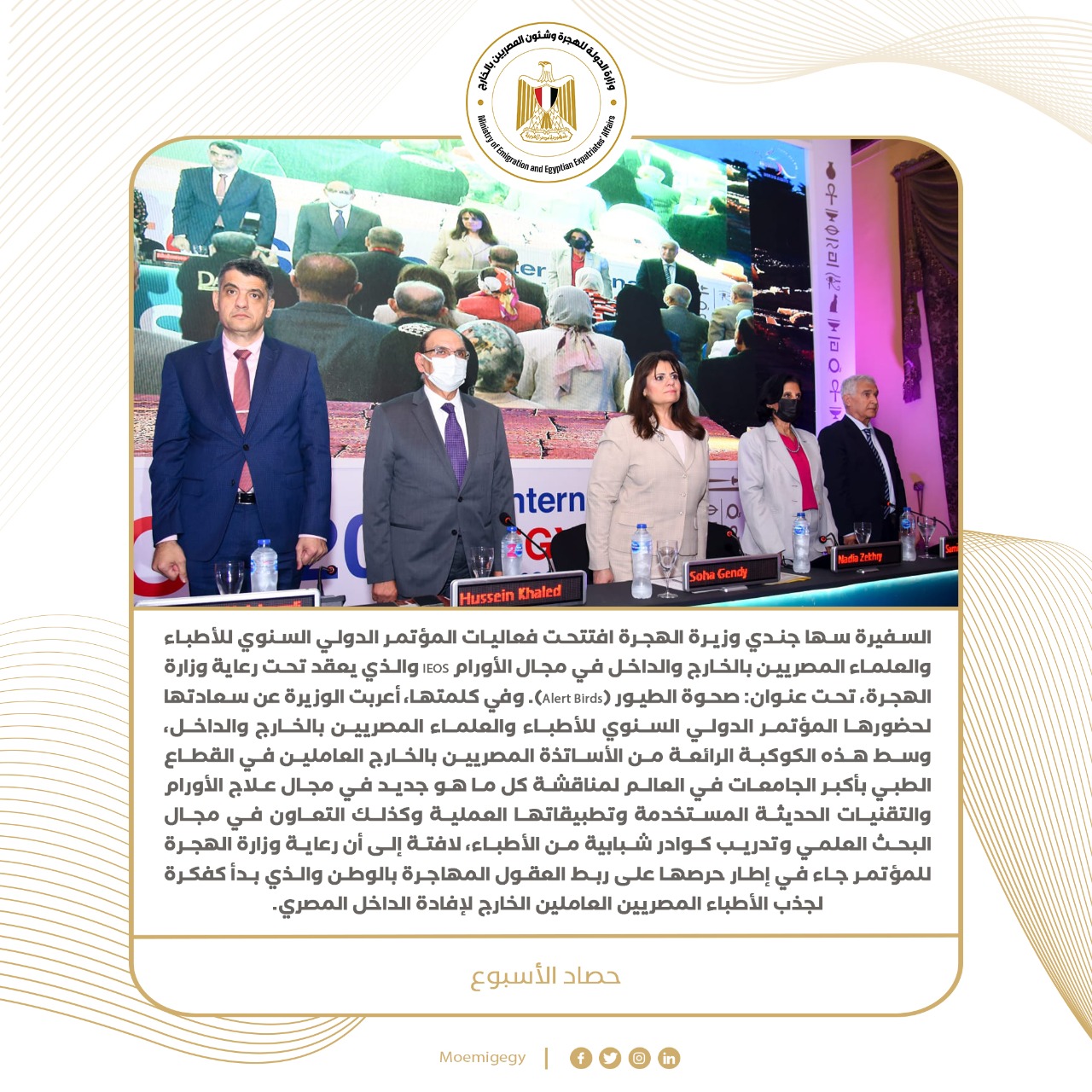 8) السفيرة سها جندي وزيرة الهجرة افتتحت فعاليات المؤتمر الدولي السنوي للأطباء والعلماء المصريين بالخارج والداخل في مجال الأورام IEOS والذي يعقد تحت رعاية وزارة الهجرة، تحت عنوان: صحوة الطيور (Alert Birds). وفي كلمتها، أعربت الوزيرة عن سعادتها لحضورها المؤتمر الدولي السنوي للأطباء والعلماء المصريين بالخارج والداخل، وسط هذه الكوكبة الرائعة من الأساتذة المصريين بالخارج العاملين في القطاع الطبي بأكبر الجامعات في العالم لمناقشة كل ما هو جديد في مجال علاج الأورام والتقنيات الحديثة المستخدمة وتطبيقاتها العملية وكذلك التعاون في مجال البحث العلمي وتدريب كوادر شبابية من الأطباء، لافتة إلى أن رعاية وزارة الهجرة للمؤتمر جاء في إطار حرصها على ربط العقول المهاجرة بالوطن والذي بدأ كفكرة لجذب الأطباء المصريين العاملين الخارج لإفادة الداخل المصري، حيث يعمل الكثير منهم في أماكن رفيعة المستوى علميا، ويرغبون في رد الجميل لوطنهم الأم، كما يعد حلقة وصل مستمرة لدعم البحث العلمي وتعميق سبل الاستفادة من خبرات الأطباء المصريين بالخارج.