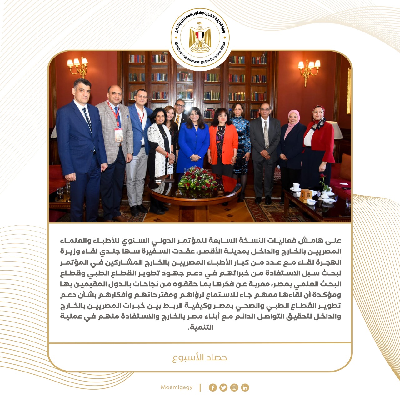 10) على هامش فعاليات النسخة السابعة للمؤتمر الدولي السنوي للأطباء والعلماء المصريين بالخارج والداخل بمدينة الأقصر، عقدت السفيرة سها جندي لقاء وزيرة الهجرة لقاء مع عدد من كبار الأطباء المصريين بالخارج المشاركين في المؤتمر لبحث سبل الاستفادة من خبراتهم في دعم جهود تطوير القطاع الطبي وقطاع البحث العلمي بمصر، معربة عن فخرها بما حققوه من نجاحات بالدول المقيمين بها ومؤكدة أن لقاءها معهم جاء للاستماع لرؤاهم ومقترحاتهم وأفكارهم بشأن دعم تطوير القطاع الطبي والصحي بمصر وكيفية الربط بين خبرات المصريين بالخارج والداخل لتحقيق التواصل الدائم مع أبناء مصر بالخارج والاستفادة منهم في عملية التنمية.