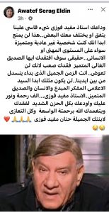 واختتمت الدكتورة عواطف سراج الدين كلامها بقولها ( الاستاذ مفيد فوزى .. الف رحمة ونور عليك وأودعك بكل الحزن الشديد لفقدك ويتغمدك الله برحمتة الواسعة وكل التعازى لأبنتك الجميلة حنان مفيد فوزى .