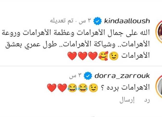 ونالت الصورة إعجاب وتفاعل الفنانين وأبرزهم الفنانة هند صبري، والفنانة منى زكي ،والفنانة درة ترد على كندة علوش في تعليقا على الصورة وكتبت مازحه «الأهرمات برده». يذكر أن آخر أعمال الفنانة كندة مسلسل «ستات بيت المعادي» الذي عرض عبر إحدى المنصات الإلكترونية، ويضم مسلسل «ستات بيت المعادي»عددا كبيرا من الفنانين، وأبرزهم أحمد وفيق، وصبري فواز، وإنجي المقدم، ونهال كمال المهدي، وميرهان حسين، وهو من تأليف محمود عزت ومن إخراج محمد سلامة.