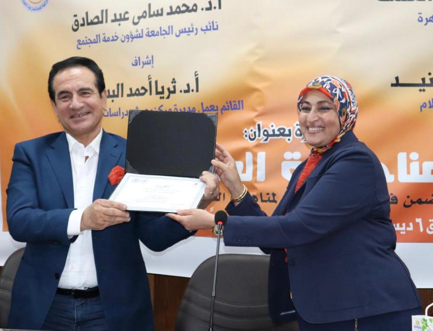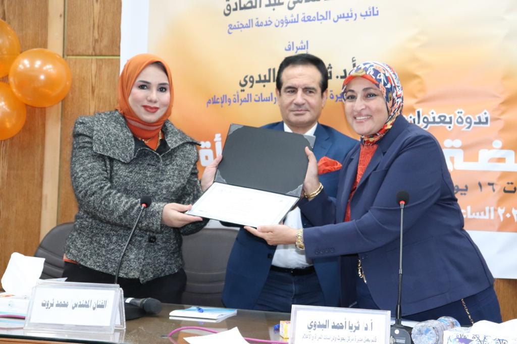 وفى ختام الندوة قدم الفنان المهندس محمد ثروت جزء من أغنية “مصريتنا وطنيتنا”، وعرض فيديو تعريفي باليوم العالمي لمناهضة العنف ضد المرأة، من إنتاج طلاب فريق المرصد الإعلامي لمركز بحوث ودراسات المرأة، أشاد به ضيوف المنصة والحضور من الطلاب، إلى جانب أداء إحدى الطالبات نشيد بلادي بلادي، وكرمت د. ثريا أحمد البدوي مدير مركز بحوث ودراسات المرأة، السادة أعضاء المنصة المتحدثين، وكذلك أعضاء الفريق البحثي والطلابي المساهم في تنظيم فعاليات الندوة .