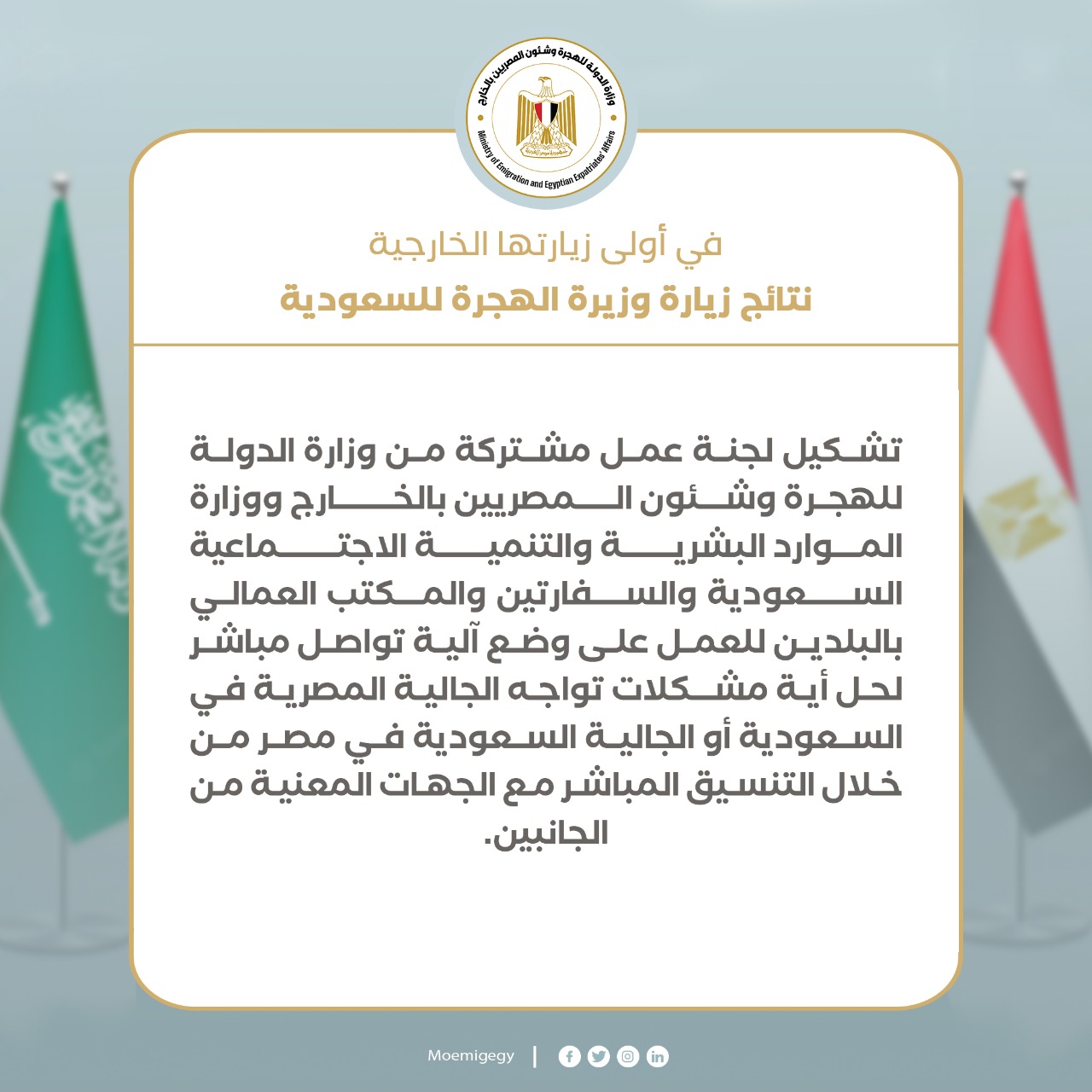 حققت زيارة السفيرة سها جندى ، للسعودية نجاحاً كبيراً وجعلت الجالية المصرية تلتف حولها ،وتستمع إلى الوفد المرافق بتمعن ،وفتحت وزيرة الهجرة النقاش لسماع رؤى ومشاكل المصريين فى السعودية ،واسفرت المناقشات إلى وضع حلول سريعة لها ،وكانت أبرز نتائج الوزيرة للسعودية ،تشكيل لجنة مشتركة بين المعنيين بشؤون العمل السعودى لتذليل جميع المعوقات التى تواجه المصريين هناك