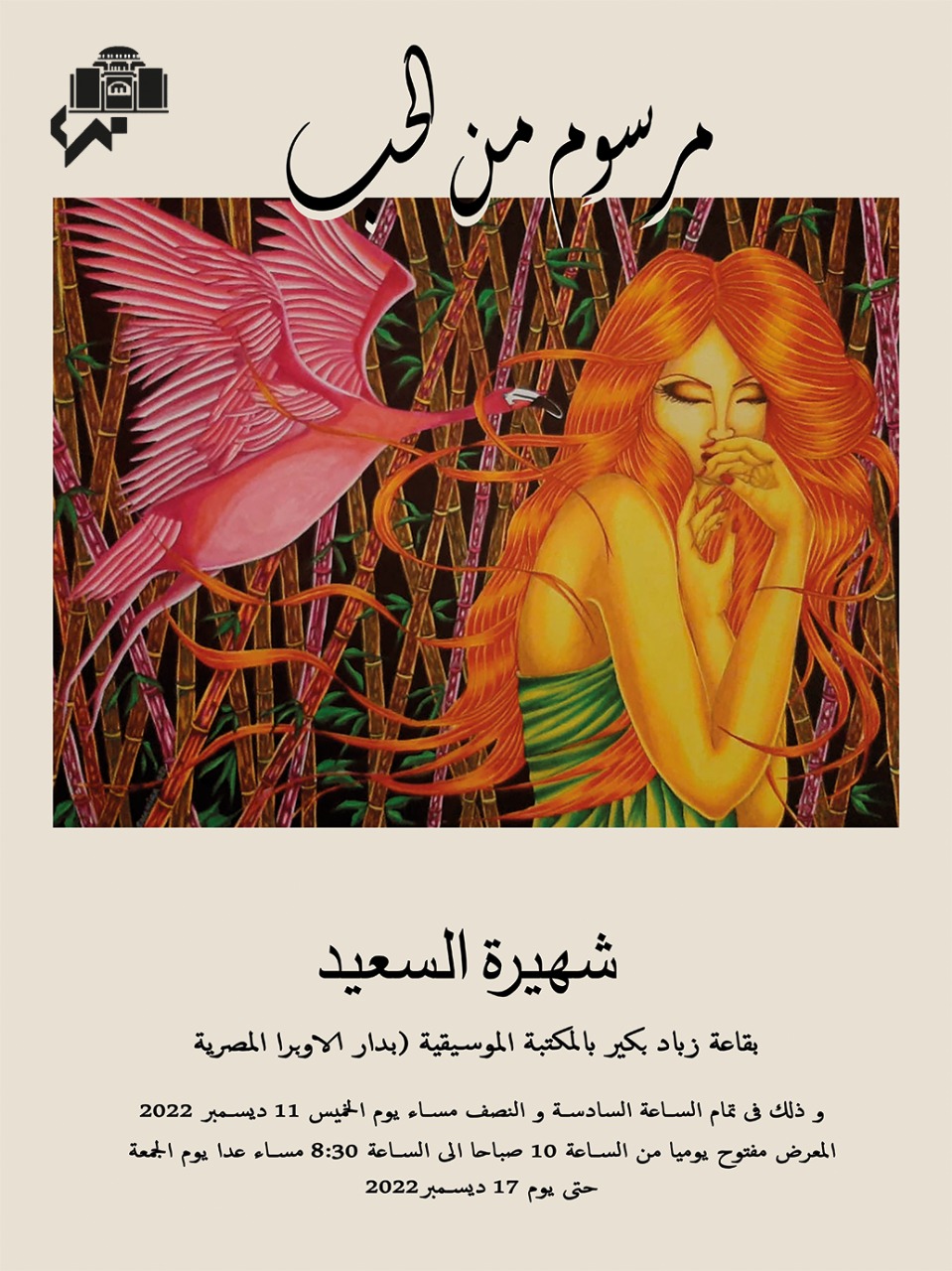 افتتح الدكتور مجدى صابر رئيس دار الاوبرا المصرية في السادسه والنصف مساء،أمس، الأحد ١١ ديسمبر بقاعة زياد بكير معرض بعنوان “مرسوم من الحب” للفنانة شهيرة السعيد الذي يضم 35 لوحة بالألوان المائية و الحبر الهندي ويستمر حتي السبت 17 ديسمبر .