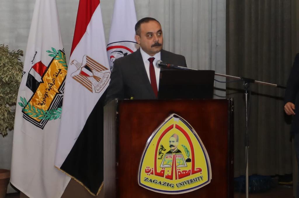 وخلال كلمته رحب رئيس الجامعة بالأستاذ الدكتور ممدوح غراب محافظ الشرقية و اللواء محمد عبد الحفيظ أبو شقة وكيل هيئة الرقابة الإدارية، كما أشاد أيضاً بالأداء المتميز لهيئة الرقابة الإدارية والدور العظيم الذي قدمته علي مدار نصف قرن من الزمان، حيث أكد علي أن ما حققته مصر في مجال القضاء علي الفساد لم يكن يتم لولا جهود الهيئة في مجال مكافحة الفساد في ظل القيادة السياسية الحكيمة لفخامة رئيس الجمهورية عبد الفتاح السيسي.