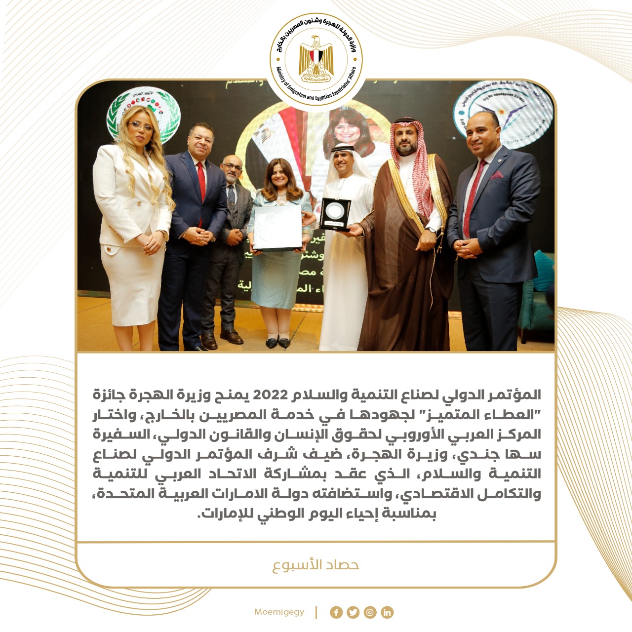 5) المؤتمر الدولي لصناع التنمية والسلام 2022 يمنح وزيرة الهجرة جائزة “العطاء المتميز” لجهودها في خدمة المصريين بالخارج، واختار المركز العربي الأوروبي لحقوق الإنسان والقانون الدولي، السفيرة سها جندي، وزيرة الهجرة، ضيف شرف المؤتمر الدولي لصناع التنمية والسلام، الذي عقد بمشاركة الاتحاد العربي للتنمية والتكامل الاقتصادي، واستضافته دولة الامارات العربية المتحدة، بمناسبة إحياء اليوم الوطني للإمارات.
