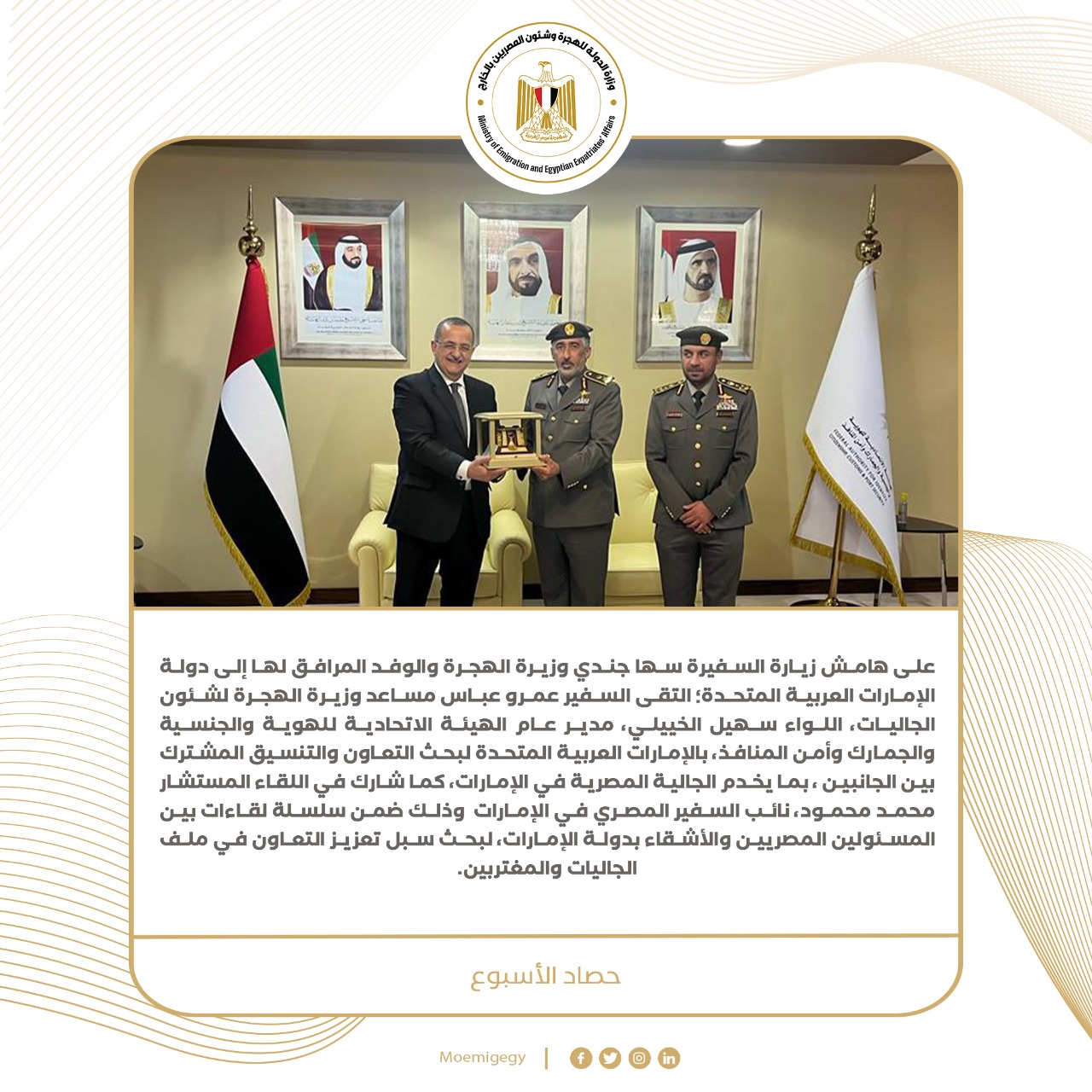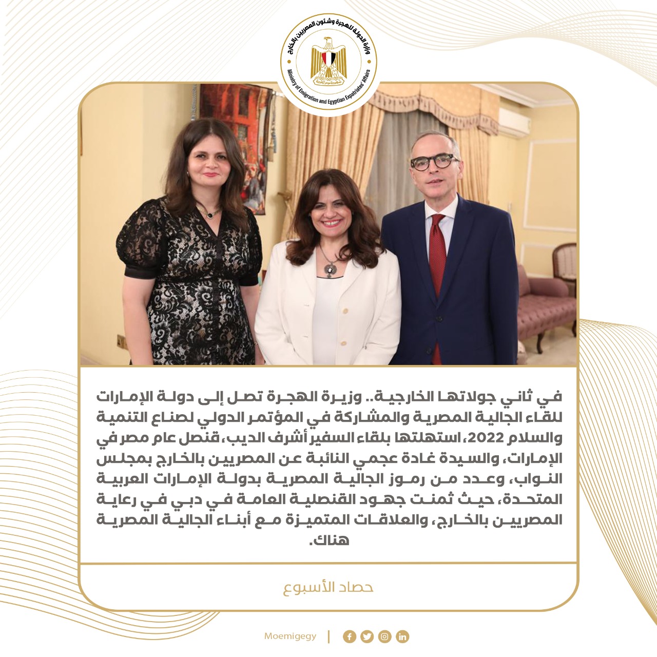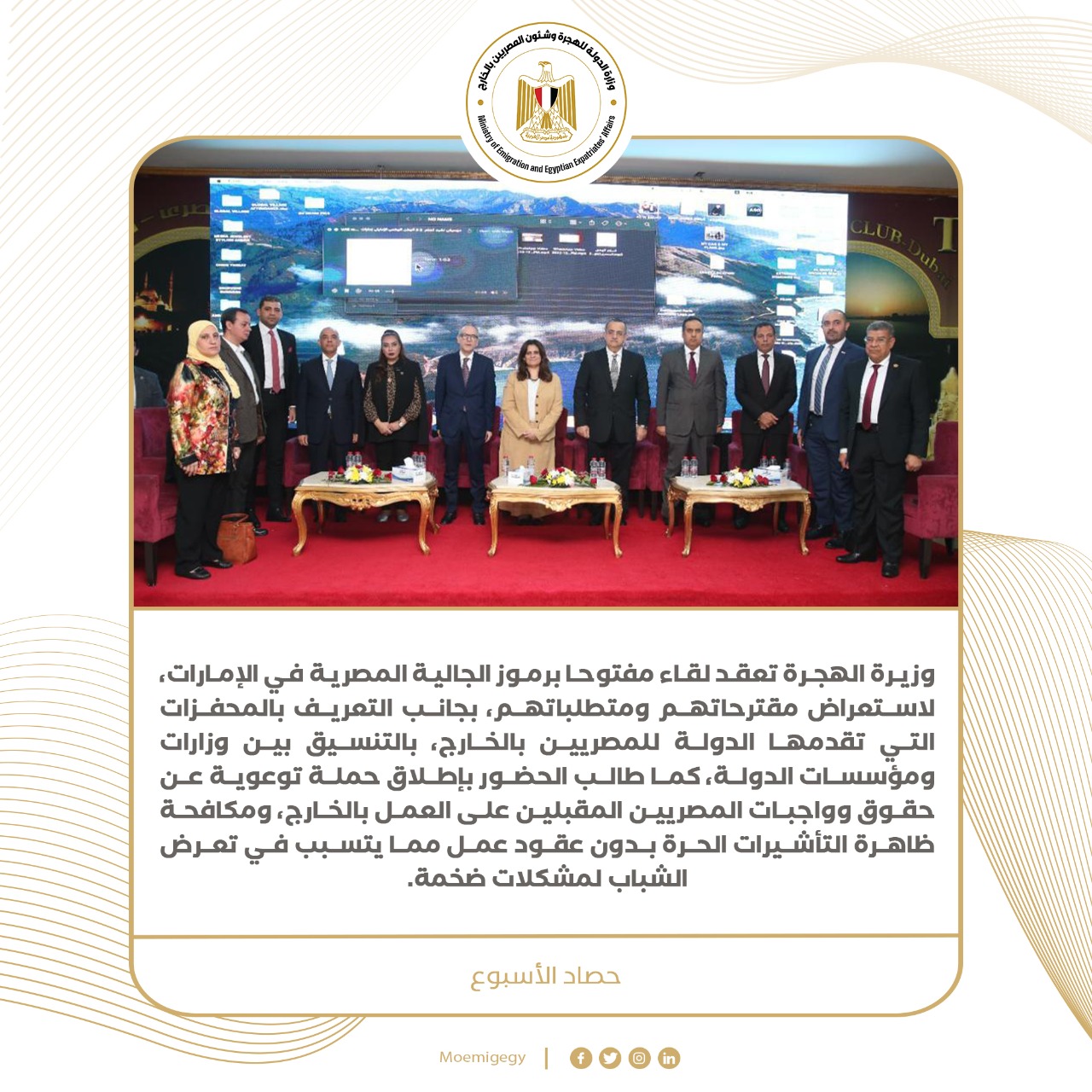 6) السفيرة سها جندي وزيرة الهجرة تعقد لقاء مفتوحا برموز الجالية المصرية في الإمارات، لاستعراض مقترحاتهم ومتطلباتهم، بجانب التعريف بالمحفزات التي تقدمها الدولة للمصريين بالخارج، بالتنسيق بين وزارات ومؤسسات الدولة، كما طالب الحضور بإطلاق حملة توعوية عن حقوق وواجبات المصريين المقبلين على العمل بالخارج، ومكافحة ظاهرة التأشيرات الحرة بدون عقود عمل مما يتسبب في تعرض الشباب لمشكلات ضخمة.