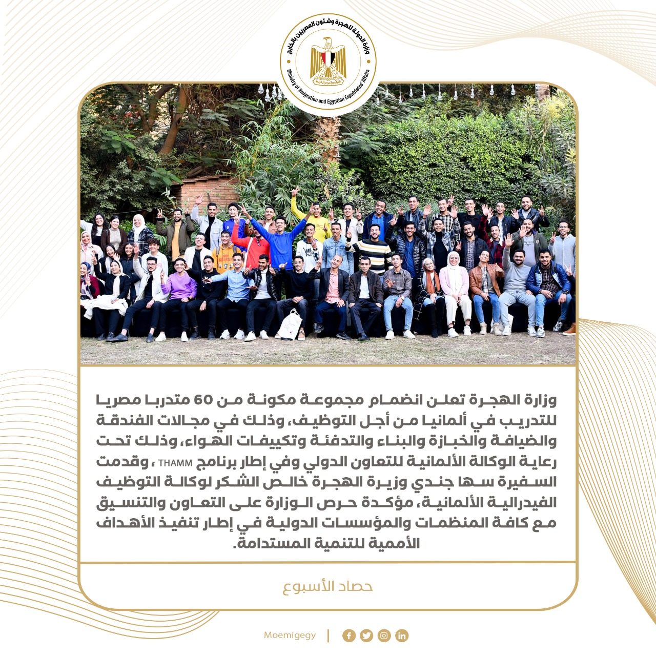 12) وزارة الهجرة تعلن انضمام مجموعة مكونة من 60 متدربا مصريا للتدريب في ألمانيا من أجل التوظيف، وذلك في مجالات الفندقة والضيافة والخبازة والبناء والتدفئة وتكييفات الهواء، وذلك تحت رعاية الوكالة الألمانية للتعاون الدولي وفي إطار برنامج THAMM ، وقدمت السفيرة سها جندي وزيرة الهجرة خالص الشكر لوكالة التوظيف الفيدرالية الألمانية.