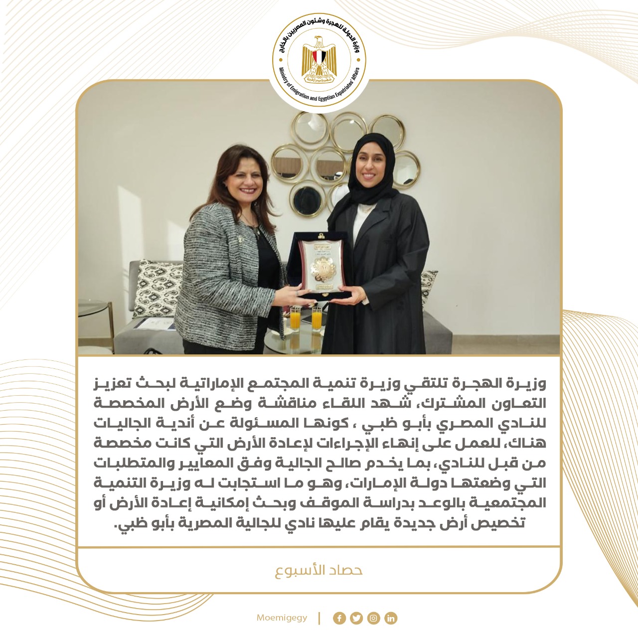 7) السفيرة سها جندي وزيرة الهجرة تلتقي وزيرة تنمية المجتمع الإماراتية لبحث تعزيز التعاون المشترك، شهد اللقاء مناقشة وضع الأرض المخصصة للنادي المصري بأبو ظبي ، كونها المسئولة عن أندية الجاليات هناك، للعمل على إنهاء الإجراءات لإعادة الأرض التي كانت مخصصة من قبل للنادي، بما يخدم صالح الجالية وفق المعايير والمتطلبات التي وضعتها دولة الإمارات، وهو ما استجابت له وزيرة التنمية المجتمعية بالوعد بدراسة الموقف وبحث إمكانية إعادة الأرض أو تخصيص أرض جديدة يقام عليها نادي للجالية المصرية بأبو ظبي.
