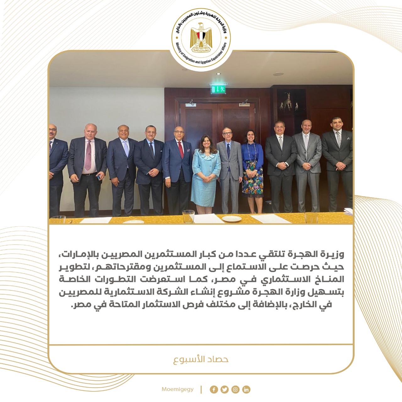 4) السفيرة سها جندي وزيرة الهجرة تلتقي عددا من كبار المستثمرين المصريين بالإمارات، حيث حرصت على الاستماع إلى المستثمرين ومقترحاتهم، لتطوير المناخ الاستثماري في مصر، كما استعرضت التطورات الخاصة بتسهيل وزارة الهجرة مشروع إنشاء الشركة الاستثمارية للمصريين في الخارج، بالإضافة إلى مختلف فرص الاستثمار المتاحة في مصر
