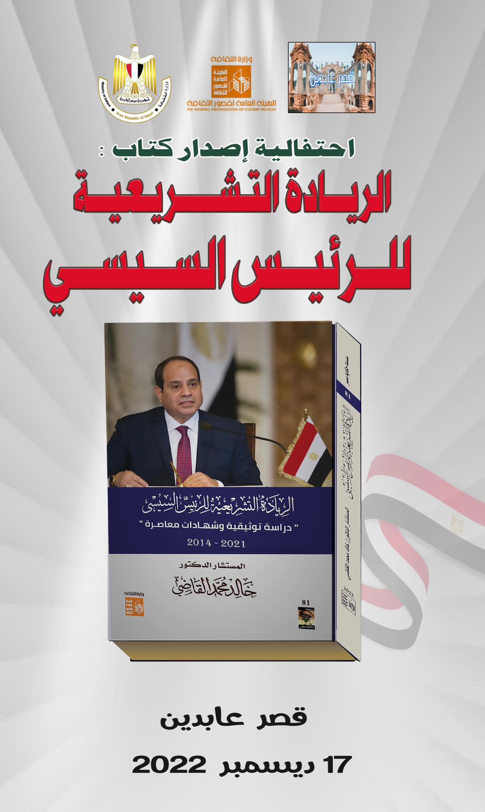 أقيمت بقصر عابدين احتفالية ثقافية لإصدار كتاب “الريادة التشريعية للرئيس السيسي” للمستشار الدكتور خالد القاضي ، والذي صدر مؤخرا عن الهيئة العامة لقصور الثقافة برئاسة الفنان هشام عطوة . بدأت الاحتفالية بعرض فيلم تسجيلي أعدته إدارة الشؤون المعنوية للقوات المسلحة بعنوان ” تحديات وإنجازات ” لفترة سنوات حكم الرئيس ، وفيلما تسجيليا آخر حول الكتاب تضمن سبب اختيار عنوانه ومنهجه وموضوعاته .