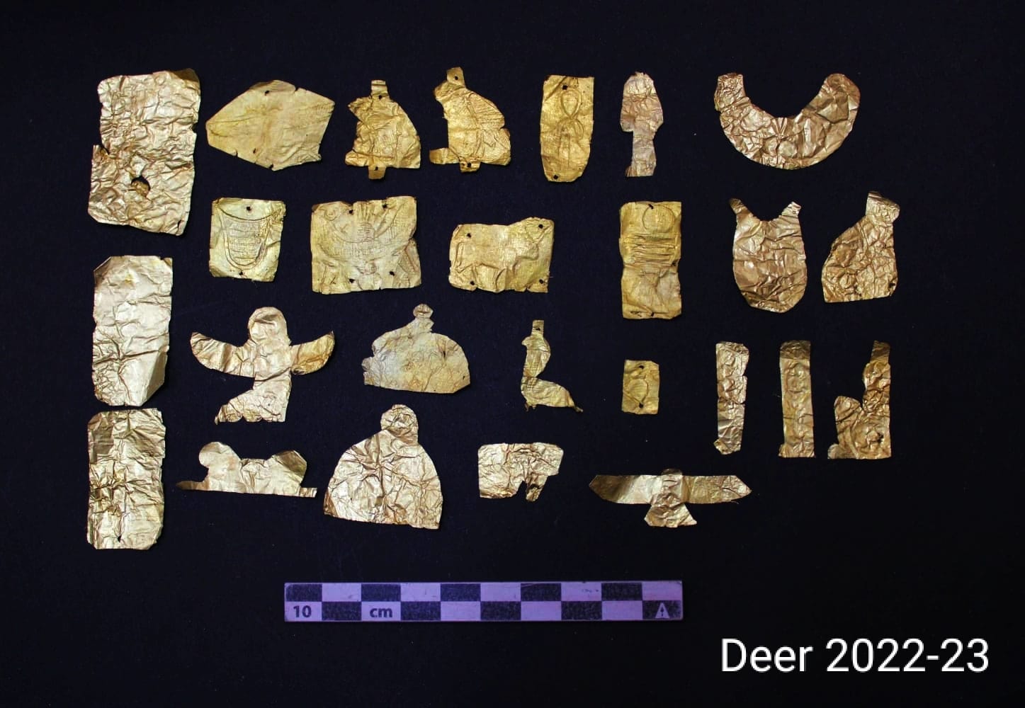 وأفاد قطب فوزي رئيس الإدارة المركزية لآثار الوجه البحري وسيناء ورئيس البعثة الأثرية أن البعثة نجحت كذلك في الكشف عن رقائق مذهبة كانت تغطي بقايا دفنات آدمية، تجسد المعبودات ايزيس، وحقات، وباستت، كذلك تجسيد لعين حورس الحامية ( اوجات)، وكذا حورس بهيئة الصقر فارداً جناحيه، بالإضافة إلى العديد من التمائم الجنائزية مختلفة الأشكال والأحجام والأحجار مثل الجعارين، وعمود الجد، ومسند الرأس، وريشتي آمون، والعديد من المعبودات منها ايزيس ونفتيس،وجحوتي، وتاورت.
