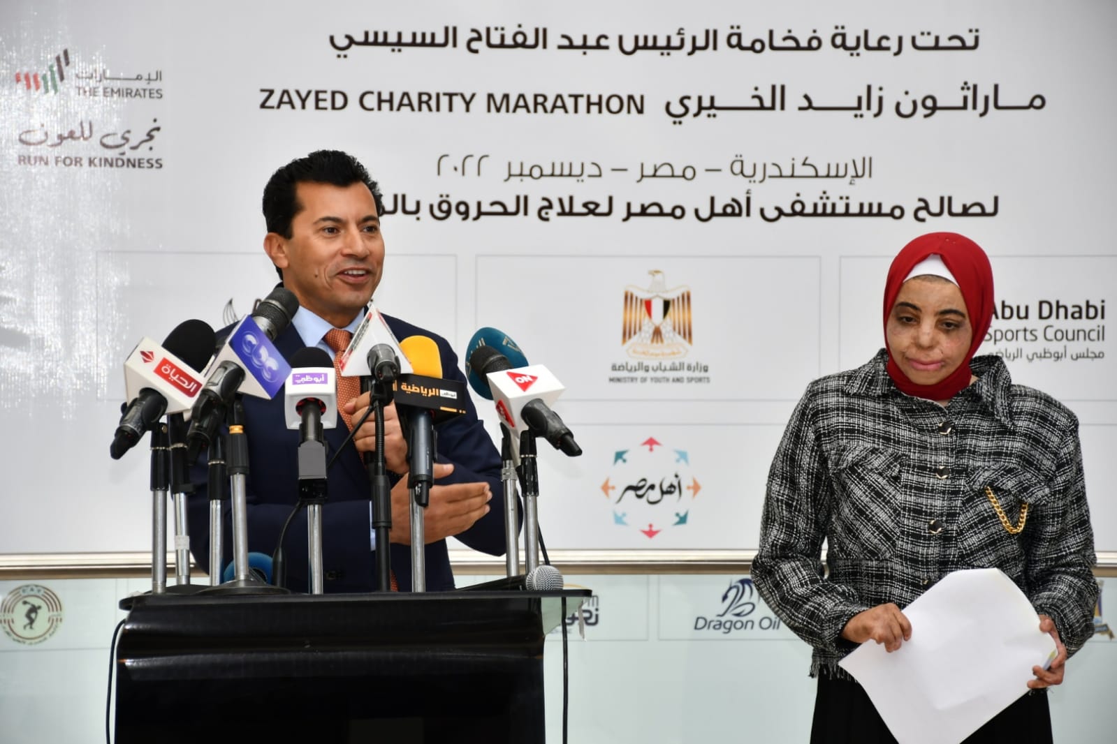 وتحدث السيد فهد عبد الرحمن بن سلطان نائب الأمين العام لقطاع التنمية والتعاون الدولي في هيئة الهلال الأحمر الإماراتي، عن نجاحات ماراثون زايد الخيري علي مدار الأعوام السابقة ومدي مشاركة الهلال الأحمر الإماراتي والمؤسسات الخيرية بدولة الإمارات، معلنًا دعم الهلال الأحمر الإماراتي امستشفي أهل مصر لعلاج الحروق بعدد من الأجهزة والمستلزمات الطبية المتطورة خلال أيام، والتكفل بأداء مناسك العمرة لمجموعة من الفائزين وأهالي المصابين بالحروق.