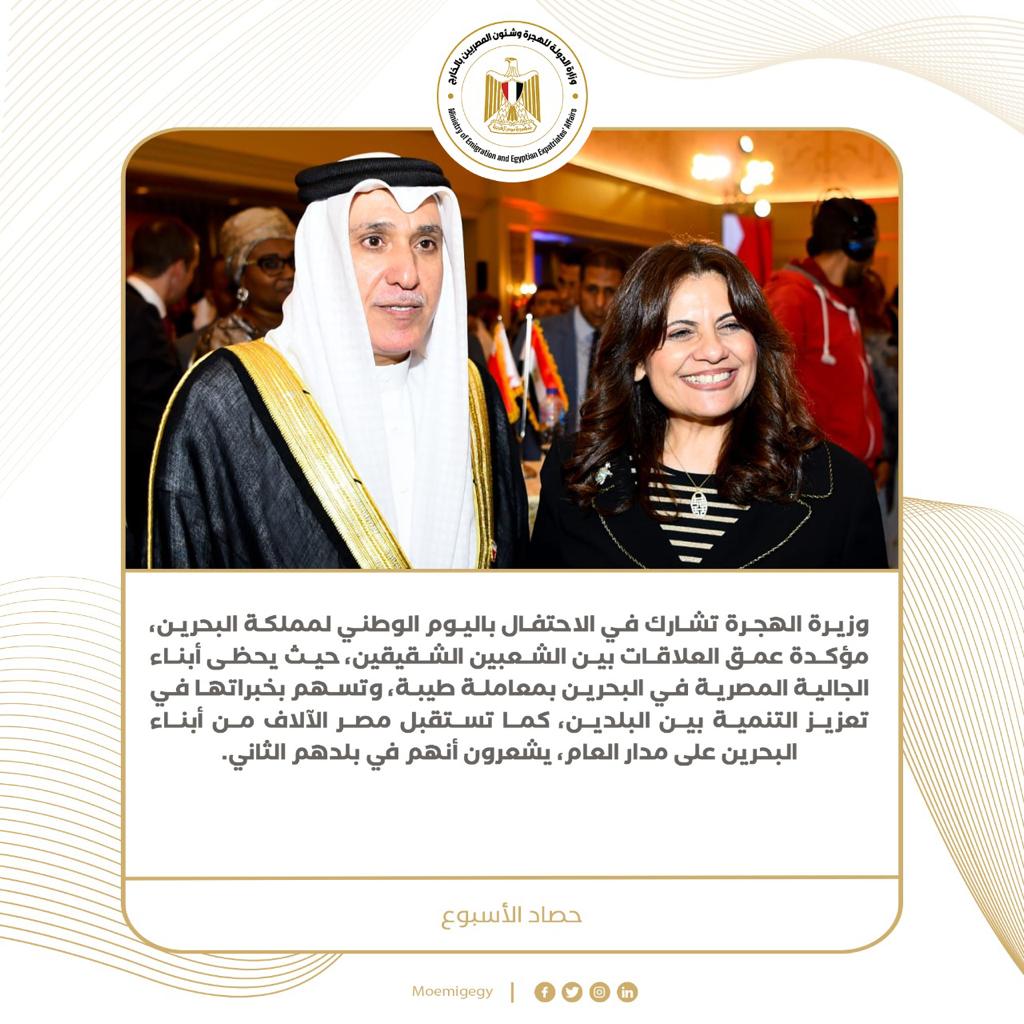 وزيرة الهجرة تشارك في الاحتفال باليوم الوطني لمملكة البحرين، مؤكدة عمق العلاقات بين الشعبين الشقيقين، حيث يحظى أبناء الجالية المصرية في البحرين بمعاملة طيبة، وتسهم بخبراتها في تعزيز التنمية بين البلدين، كما تستقبل مصر الآلاف من أبناء البحرين على مدار العام، يشعرون أنهم في بلدهم الثاني.