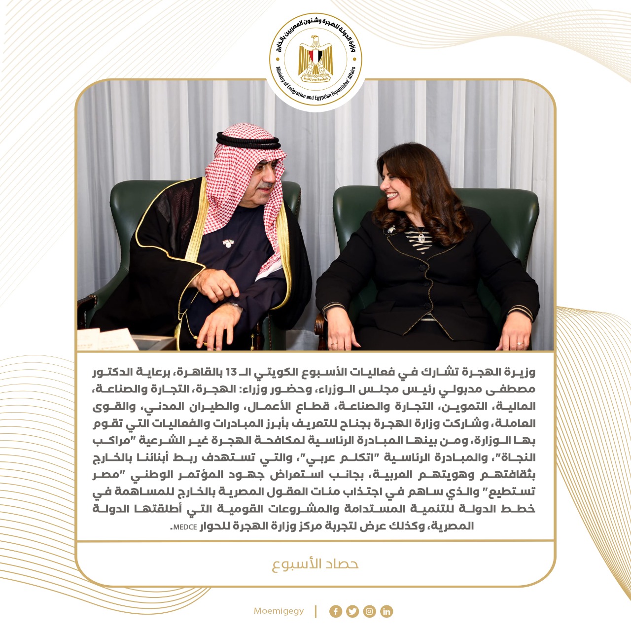 وزيرة الهجرة تشارك في فعاليات الأسبوع الكويتي الـ 13 بالقاهرة، برعاية الدكتور مصطفى مدبولي رئيس مجلس الوزراء، وحضور وزراء: الهجرة، التجارة والصناعة، المالية، التموين، التجارة والصناعة، قطاع الأعمال، والطيران المدني، والقوى العاملة، وشاركت وزارة الهجرة بجناح للتعريف بأبرز المبادرات والفعاليات التي تقوم بها الوزارة، ومن بينها المبادرة الرئاسية لمكافحة الهجرة غير الشرعية “مراكب النجاة”، والمبادرة الرئاسية “اتكلم عربي”، والتي تستهدف ربط أبنائنا بالخارج بثقافتهم وهويتهم العربية، بجانب استعراض جهود المؤتمر الوطني “مصر تستطيع” والذي ساهم في اجتذاب مئات العقول المصرية بالخارج للمساهمة في خطط الدولة للتنمية المستدامة والمشروعات القومية التي أطلقتها الدولة المصرية، وكذلك عرض لتجربة مركز وزارة الهجرة للحوار MEDCE.