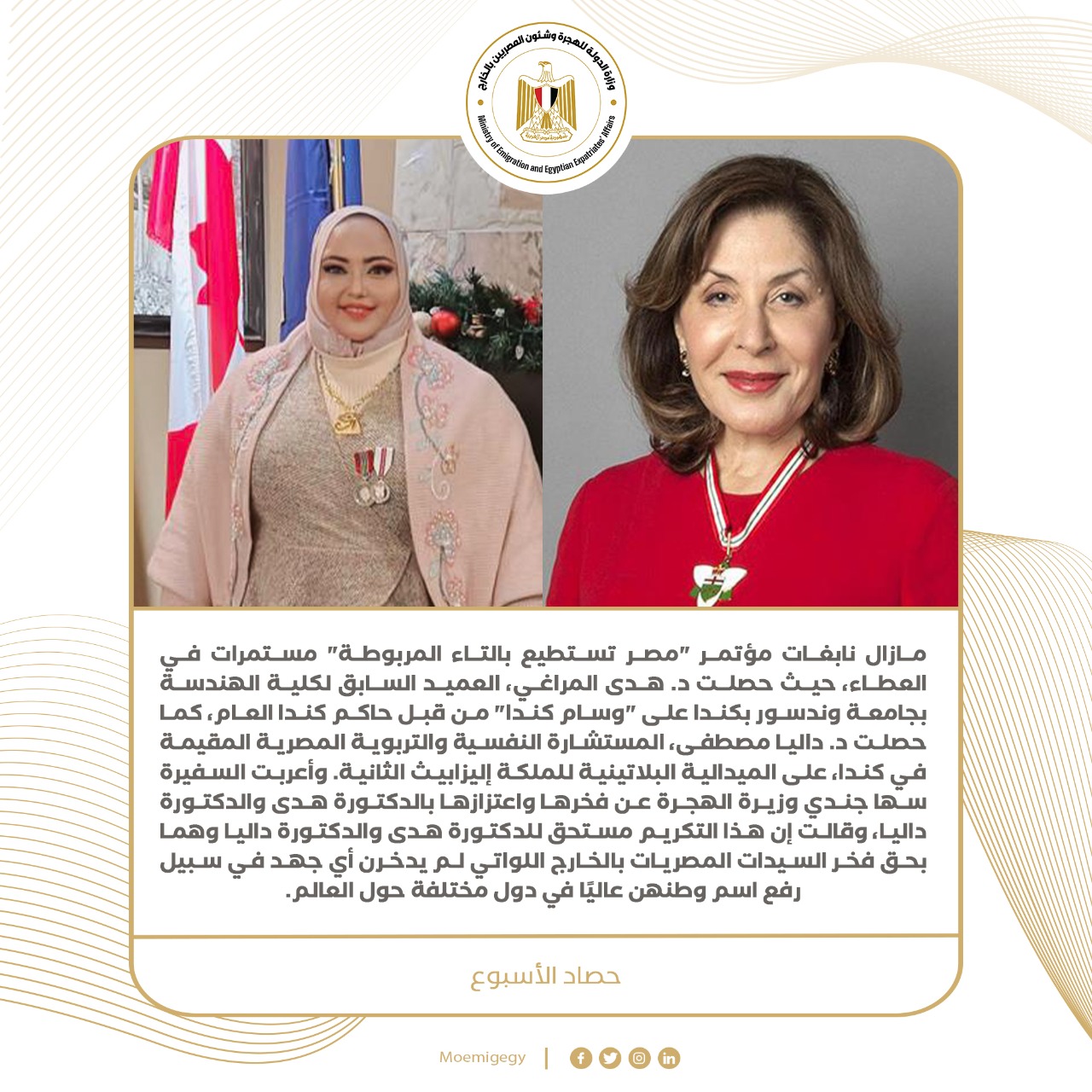 مازال نابغات مؤتمر “مصر تستطيع بالتاء المربوطة” مستمرات في العطاء، حيث حصلت د. هدى المراغي، العميد السابق لكلية الهندسة بجامعة وندسور بكندا على “وسام كندا” من قبل حاكم كندا العام، كما حصلت د. داليا مصطفى، المستشارة النفسية والتربوية المصرية المقيمة في كندا، على الميدالية البلاتينية للملكة إليزابيث الثانية.