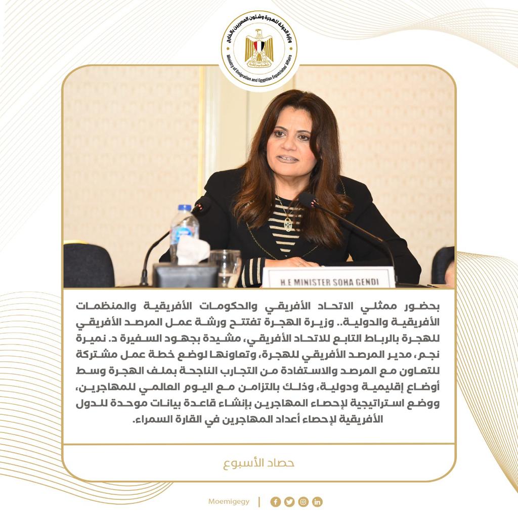 بحضور ممثلي الاتحاد الأفريقي والحكومات الأفريقية والمنظمات الأفريقية والدولية.. وزيرة الهجرة تفتتح ورشة عمل المرصد الأفريقي للهجرة بالرباط التابع للاتحاد الأفريقي، مشيدة بجهود السفيرة د. نميرة نجم، مدير المرصد الأفريقي للهجرة، وتعاونها لوضع خطة عمل مشتركة للتعاون مع المرصد والاستفادة من التجارب الناجحة بملف الهجرة وسط أوضاع إقليمية ودولية، وذلك بالتزامن مع اليوم العالمي للمهاجرين، ووضع استراتيجية لإحصاء المهاجرين بإنشاء قاعدة بيانات موحدة للدول الأفريقية لإحصاء أعداد المهاجرين في القارة السمراء.