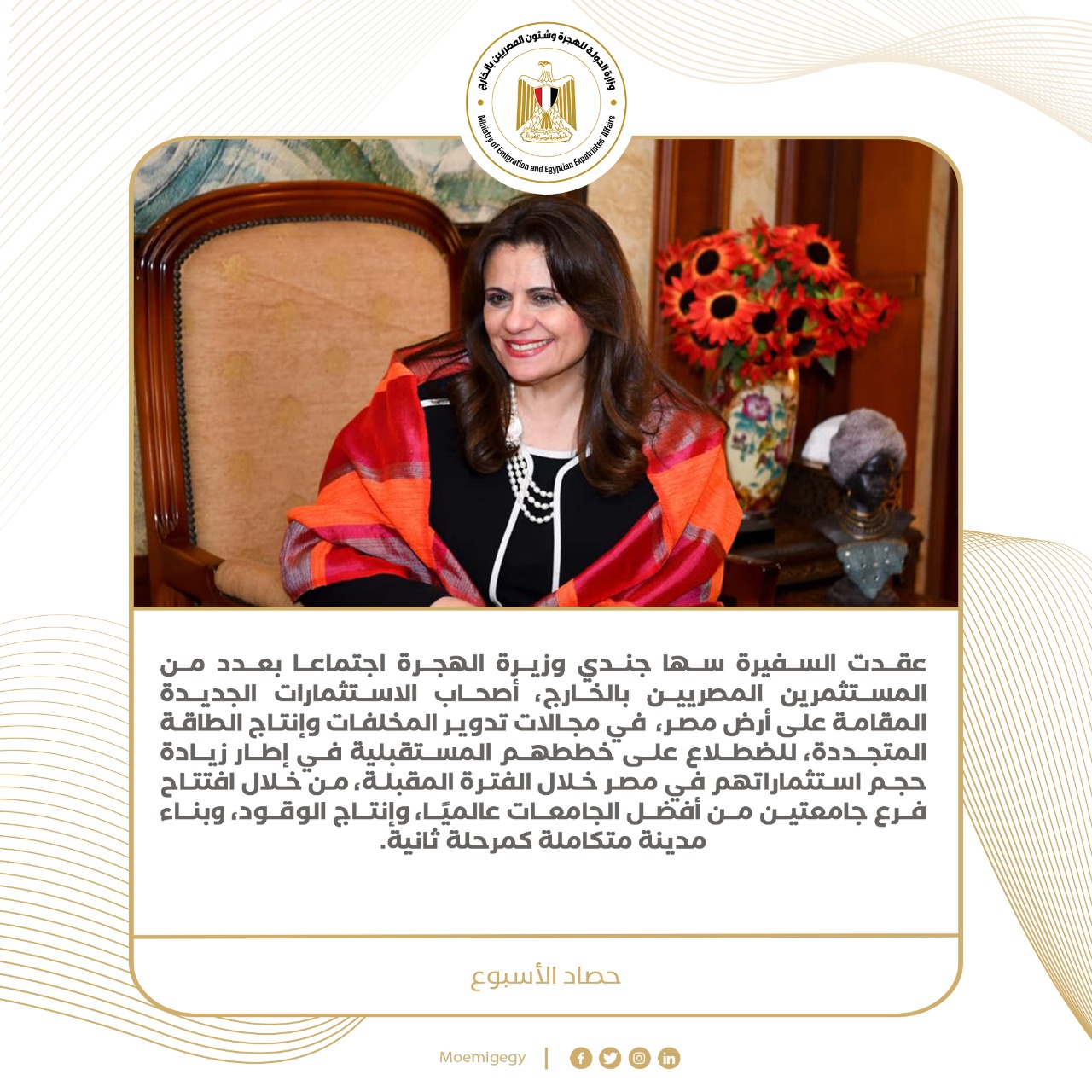 عقدت السفيرة سها جندي اجتماعا مع عدد من المستثمرين المصريين بالخارج أصحاب الاستثمارات الجديدة المقامة على أرض مصر، في مجالات تدوير المخلفات وإنتاج الطاقة المتجددة، وذلك للاطلاع على خططهم المستقبلية في إطار زيادة حجم استثماراتهم في مصر خلال الفترة المقبلة، من خلال افتتاح فرع جامعتين من أفضل الجامعات عالميا وإنتاج الوقود وبناء مدينة متكاملة.