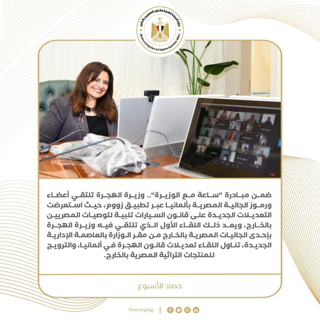 ضمن مبادرة “ساعة مع الوزيرة”.. وزيرة الهجرة تلتقي أعضاء ورموز الجالية المصرية بألمانيا عبر تطبيق زووم، حيث استعرضت التعديلات الجديدة على قانون السيارات تلبية لتوصيات المصريين بالخارج، ويعد ذلك اللقاء الأول الذي تلتقي فيه وزيرة الهجرة بإحدى الجاليات المصرية بالخارج من مقر الوزارة بالعاصمة الإدارية الجديدة، تناول اللقاء تعديلات قانون الهجرة في ألمانيا، والترويج للمنتجات التراثية المصرية بالخارج.