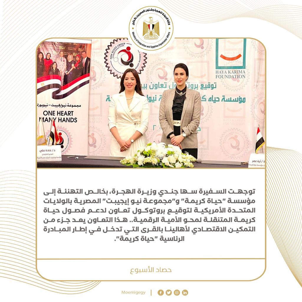 توجهت السفيرة سها جندي وزيرة الهجرة، بخالص التهنئة إلى مؤسسة “حياة كريمة” و”مجموعة نيو إيجيبت” المصرية بالولايات المتحدة الأمريكية لتوقيع بروتوكول تعاون لدعم فصول حياة كريمة المتنقلة لمحو الأمية الرقمية.. هذا التعاون يعد جزء من التمكين الاقتصادي لأهالينا بالقرى التي تدخل في إطار المبادرة الرئاسية “حياة كريمة”.