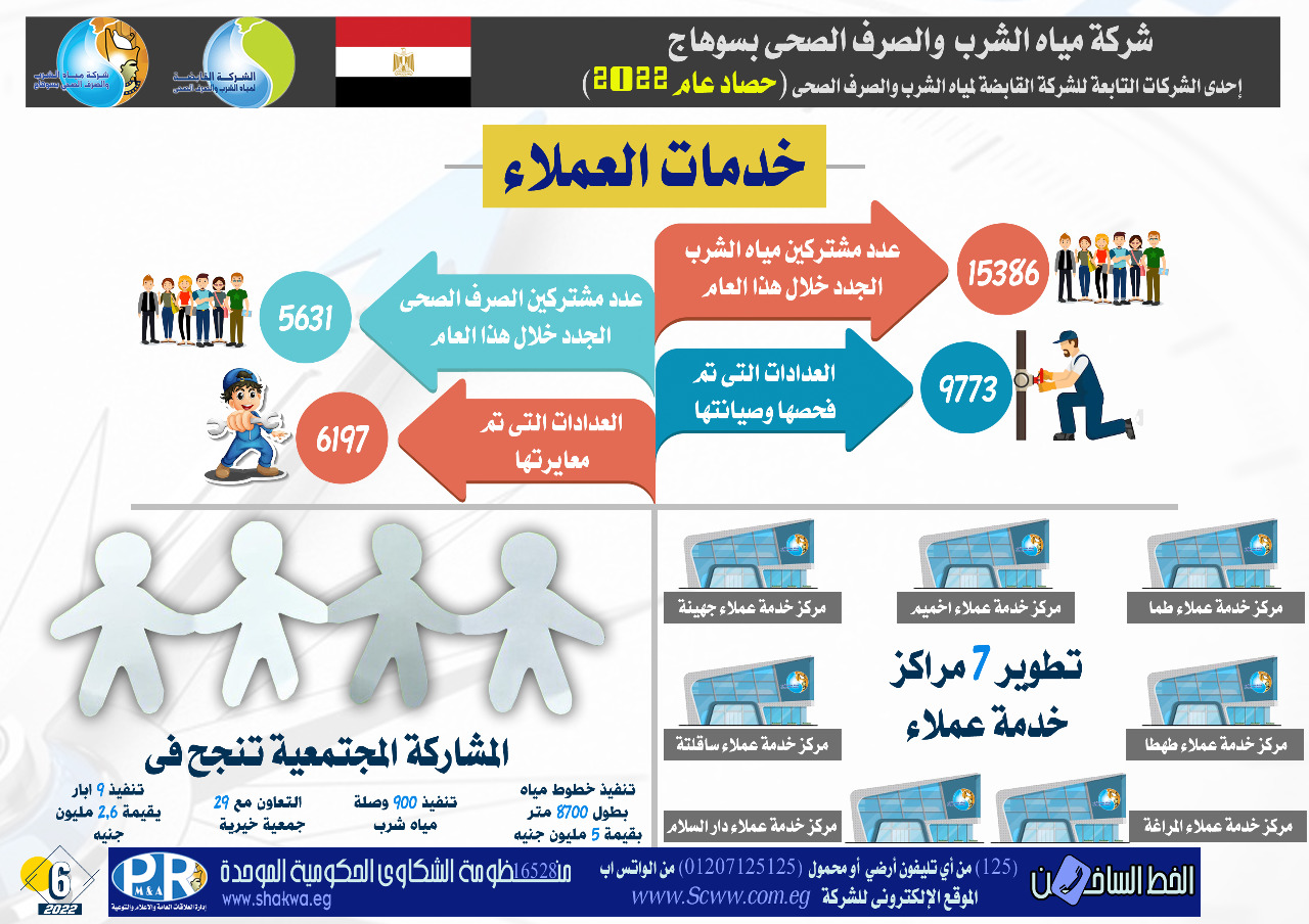 بلغ عدد المشتركين الجدد بخدمة مياه الشرب خلال عام 2022 نحو 15386 مشتركا، وبلغ عدد المشتركين بخدمة الصرف الصحى 5631 مشتركا، كما تم تغيير 16084 عدادا عاطلا وتركيب 23180 عدادا مسبق الدفع وبيع 62184 قطعة موفرة للمياه، كما تم فحص 9773 عدادا ومعايرة 6197 عدادا للمواطنين، وتم الانتهاء من تطوير 7 مراكز خدمة عملاء لتقديم الخدمات للمواطنين فى سهولة ويسر، وفى مجال المشاركة المجتمعية تم توقيع بروتوكولات تعاون مشترك مع 29 جمعية خيرية وتنفيذ خطوط مياه بأطوال 8700 متر بقيمة 5 ملايين جنيه وتنفيذ 900 وصلة مياه منزلية و9 آبار مياه بقيمة 2.6 مليون جنيه.