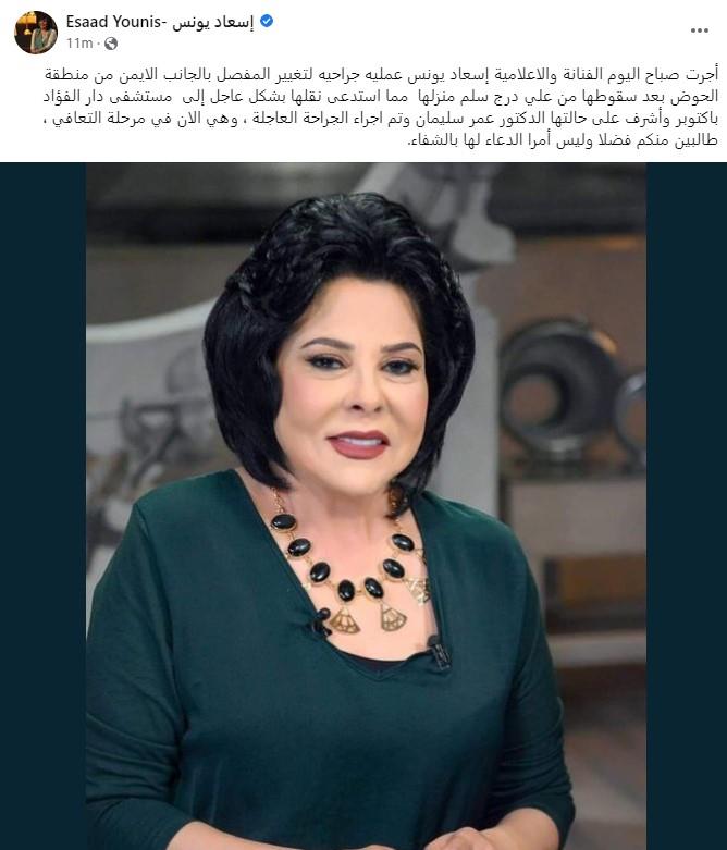 وأكد الحساب الرسمي للفنانة إسعاد يونس، بموقع التواصل الاجتماعي “فيسبوك”، أن الإصابة استدعت نقلها بشكل عاجل إلى مستشفى دار الفؤاد بأكتوبر، وأشرف على حالتها الدكتور عمر سليمان، وتم إجراء الجراحة العاجلة، وهي الآن في مرحلة التعافي، طالبين منكم فضلا وليس أمرًا الدعاء لها بالشفاء.