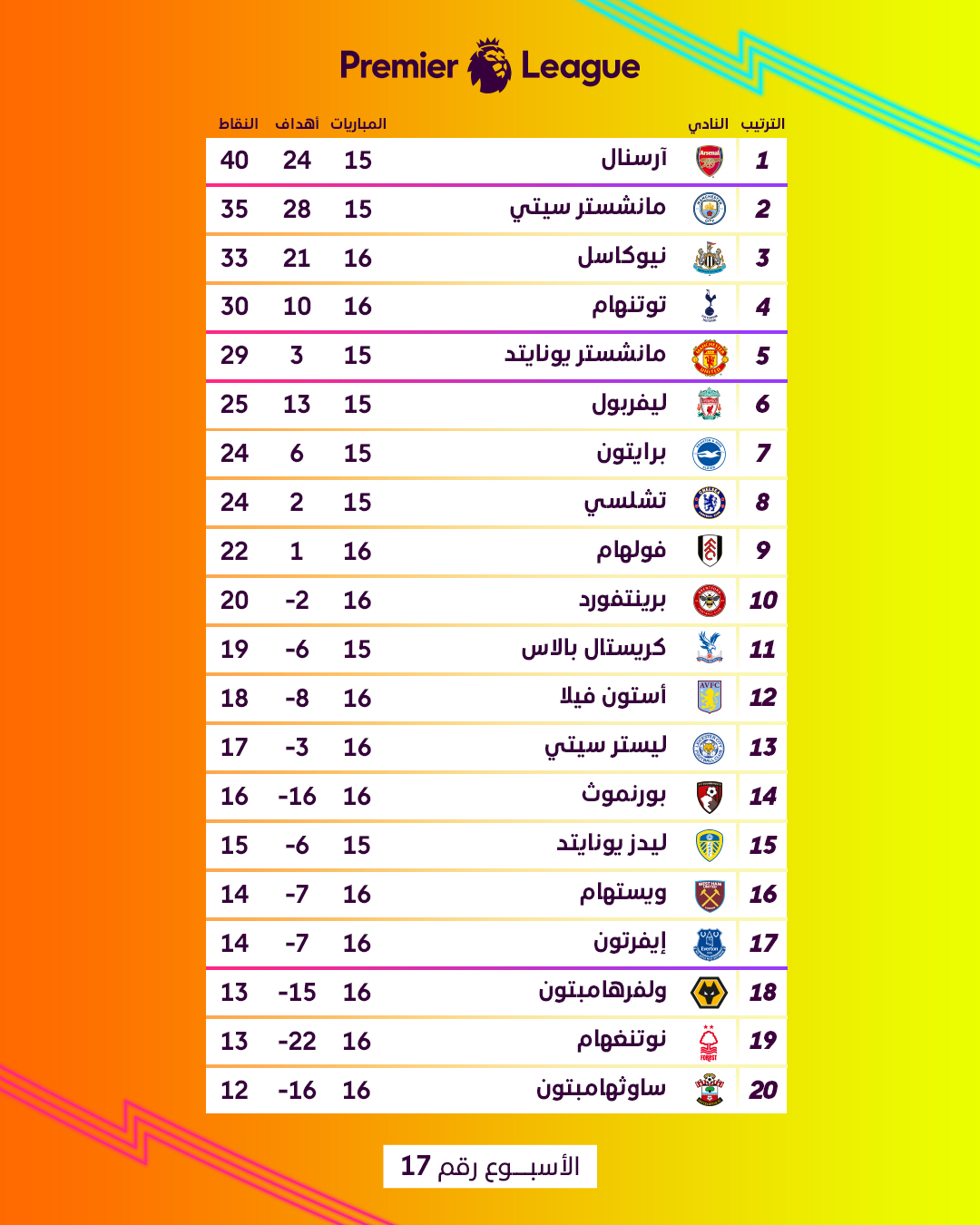 تمسك نادي أرسنال بصدارة ترتيب الدوري الإنجليزي برصيد 40 نقطة جمعها من الفوز في 13 مباراة والتعادل في 1 وخسارة مثلها وتسجيل 36 هدفاً وتلقى 12.