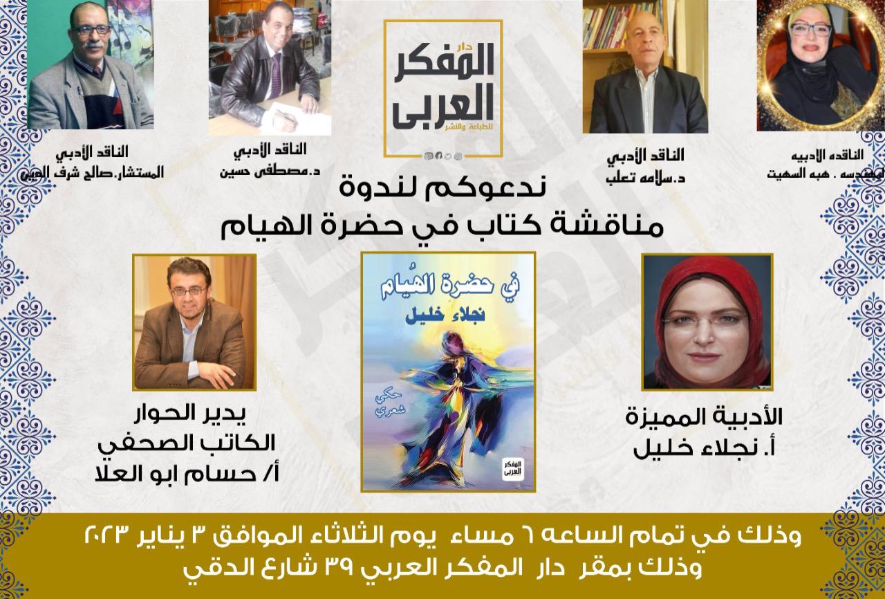 تقام في مساء يوم الثلاثاء الموافق ٣ من يناير ٢٠٢٣ بمقر دار المفكر العربي ندوة ثقافية لمناقشة كتاب الحكي الشعري ” في حضرة الهُيام” للكاتبة والشاعرة نجلاء خليل ، حيث يدير اللقاء الكاتب الكبير حسام أبو العلا ، والذي قام بتوجيه دعوة عامة للحضور في تمام السادسة مساءً بمقر دار المفكر العربي ٣٩ شارع الدقي.. كما أعلن أبو العلا عن وجود دار المفكر العربي للنشر والتوزيع بمعرض القاهرة الدولي للكتاب في دورته المزمع إقامتها في ٢٤ من يناير الجاري بعدة إصدارات تنوعت بين الشعر والرواية والمجموعات القصصية والدراسات النقدية.