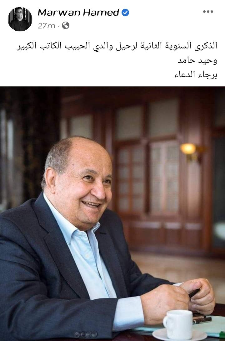 أحيا المخرج مروان حامد زكرى وفاة والده الكاتب والسيناريست وحيد حامد، الذي رحل عن عالمنا في مثل هذا اليوم الموافق 2 يناير 2021. حيث شارك مروان حامد صورة والدة وحيد حامد عبر حسابه الشخصي بموقع التواصل الاجتماعي «فيسبوك» وعلق عليها كاتبا :«الذكرى السنوية الثانية لرحيل والدي الحبيب الكاتب الكبير وحيد حامد برجاء الدعاء». معلومات عن الكاتب والسيناريست الراحل وحيد حامد -وُلد الكاتب والسيناريست وحيد حامد في 1 يوليو عام 1944، بقرية بني قريش مركز منيا القمح في محافظة الشرقيّة. ــ حصل على ليسانس آداب قسم اجتماع عام 1965. -بدأ وحيد حامد مشواره مع الكتابة منذُ أواخر الستينيات وامتد مشواره لسنوات طويلة. ــ عُرف بتقديمه لأعمال اجتماعية ذات بعد سياسي تناقش قضايا المجتمع المصري. ــ حيث قدم الراحل وحيد حامد عشرات الأفلام والمسلسلات.