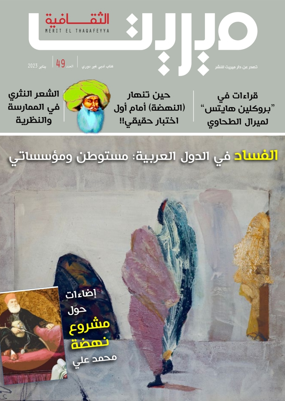 صدر عدد يناير من ميريت الثقافية صدرت في الأول من يناير دورية ميريت والتي تحمل رقم ٤٩ في عدد الإصدارات الشهرية للمجلة. ميريت الثقافية تصدر في صورة إلكترونية وتحقق صدى في الأوساط الثقافية المصرية والعربية. وفي هذا العدد كانت الكلمة الافتتاحية لرئيس التحرير سمير درويش تحت عنوان: ” إعلان خروج الشعب من صراع ليس طرفا *فيه”* وأشار الغلاف إلى عدة عناوين: – الفساد في الدول العربية مستوطن ومؤسساتي. – قرارات في بروكلين هايتس لميرال الطحاوي. – الشعر النثري في الممارسة والنظرية. – حين تنهار النهضة أمام أول اختبار حقيقي، والذي جاء ضمن الملف الثقافي لهذا العدد، حيث كتبت عدة أقلام تحت عنوان: إضاءات حول مشروع نهضة محمد علي. بالإضافة إلى أقسام إبداع ومبدعون، ثقافات وفنون وغيرها من الأبواب.