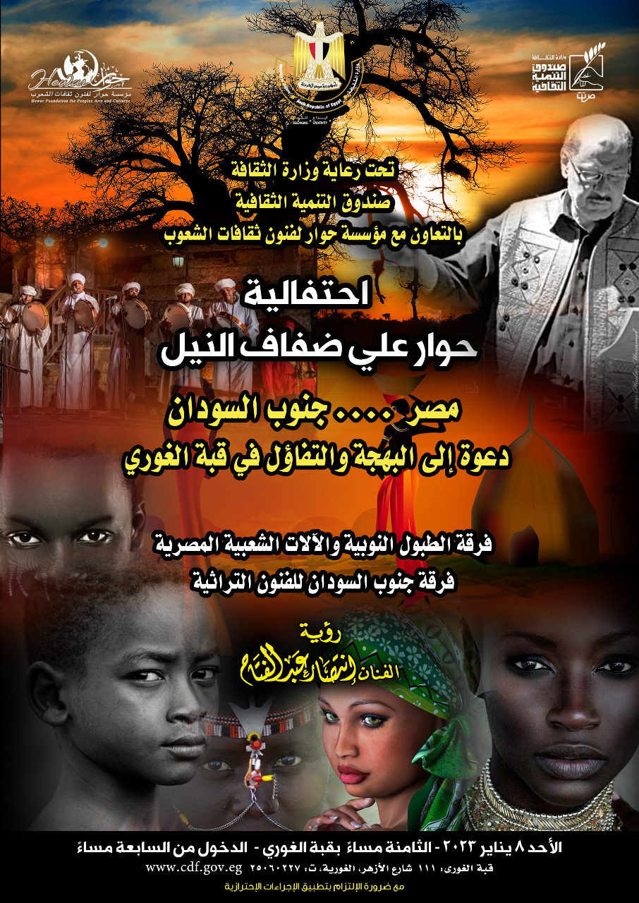 وذلك في الثامنة مساء الأحد 8 يناير الجاري رؤية وإخراج الفنان انتصار عبد الفتاح يتضمن الحفل عرض فنون شعبية تقدمه فرقة الطبول النوبية والآلات الشعبية المصرية، بمشاركة فرقة جنوب السودان للفنون التراثية، .
