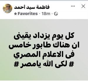 قالت الدكتورة فاطمة سيد أحمد فى منشور ظهر منذ قليل على صفحتها فى موقع التواصل الإجتماعى فيسبوك : (كل يوم بزداد يقينى أن هناك طابور خامس فى الإعلام المصرى ) .