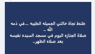 —————————— بوابة “مصر الآن” | متابعات أعلنت المخرجة هالة خليل، وفاة خالتها عبر حسابها على فيس بوك، وكتبت هالة قائلة:…