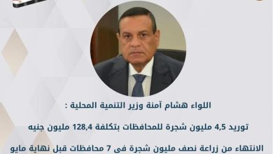 وزير التنمية المحلية: توريد 4,5 مليون شجرة للمحافظات بتكلفة 128,4 مليون جنيه