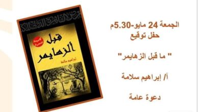 تنظم مكتبة مصر الجديدة العامة حفل توقيع ومناقشة كتاب ( ماقبل الزهايمر ) للمؤلف ابراهيم سلامة الكتاب يتناول اسباب حدوث…