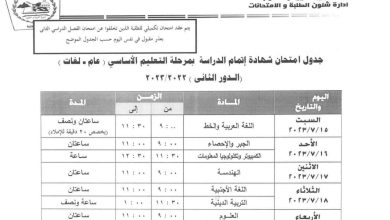 تنطلق امتحانات “الدور الثانى” للعام الدراسي 2022/2023 لطلاب شهادة إتمام الدراسة بمرحلة التعليم الأساسى (عام – لغات) بمحافظة الجيزة، يوم…