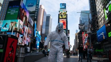 صينى يسير فى “تايمز سكوير” مرتديًا 27 بدلة واقية ضد كورونا.. اعرف القصة