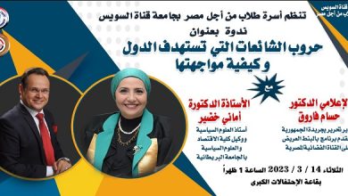 تقام في الواحدة ظهر اليوم الثلاثاء في قاعة الاحتفالات الكبرى بجامعة قناة السويس بالإسماعيلية، ندوة بعنوان “حروب الشائعات التي تواجه الدول…