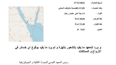 سجلت محطات الشبكة القومية للزلازل التابعة للمعهد القومى للبحوث الفلكية والجيوفيزيقية اليوم الثلاثاء الموافق 27 ديسمبر 2022، بزلزال بقوة 5…