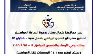—————————— بوابة “مصر الآن” | متابعات تستأنف، اليوم الأربعاء، فعاليات سباق الهجن بالعريش على ساحل شمال سيناء، ويطلق اللواء عبد…